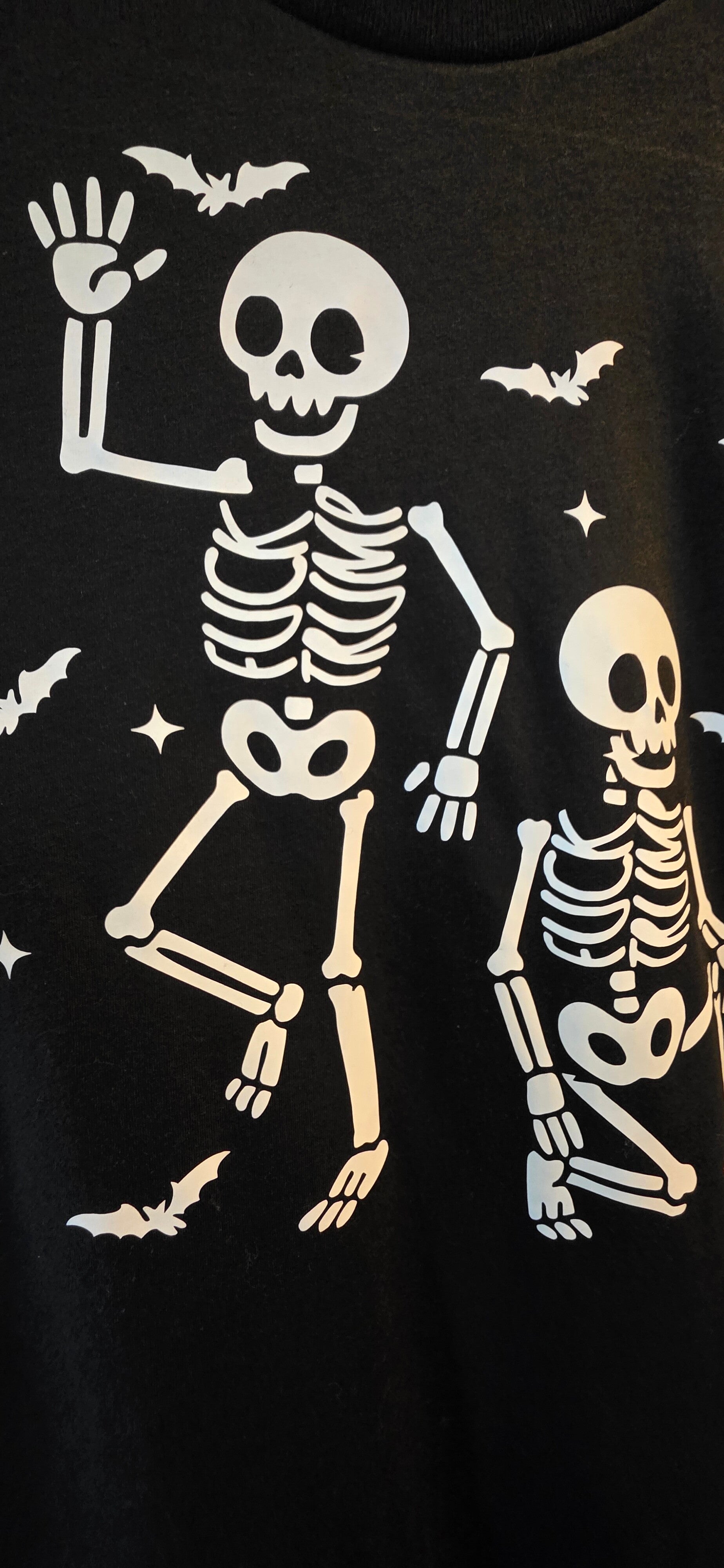 Get into the spooky spirit with this playful Dancing Skeletons Halloween Tee. Featuring two friendly skeletons striking fun poses surrounded by bats and stars, this shirt brings just the right mix of creepy and cute. Plus it adds a hidden message in it. Please make sure that you have read the ribs on the skeleton.
