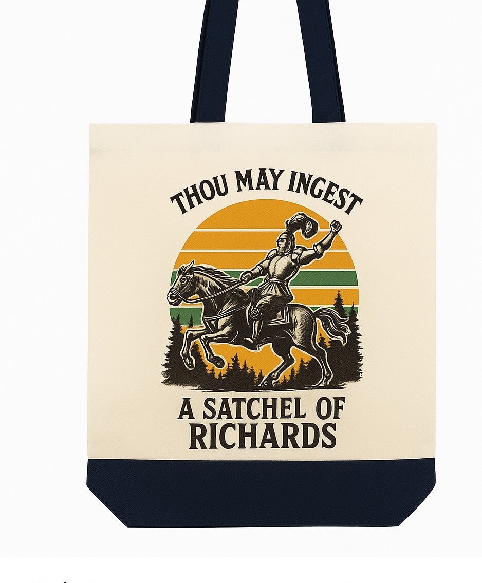 Carry your essentials with a touch of medieval flair and a dash of humor! This canvas tote bag features a bold knight-on-horseback design with the hilarious phrase: "Thou May Ingest a Satchel of Richards." Perfect for those who love witty, tongue-in-cheek statements with a vintage aesthetic. 15x13